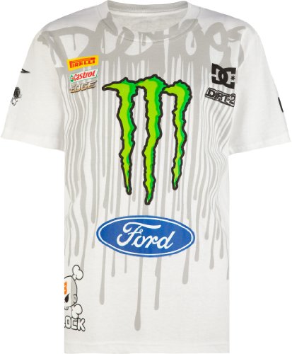 DC Block Ford tee. Screen print graphics including Ford, Monster, DC, Castrol, Edge, and 43 Block logos. Short sleeve. Crew neck. 100% cotton. Machine wash. Imported.